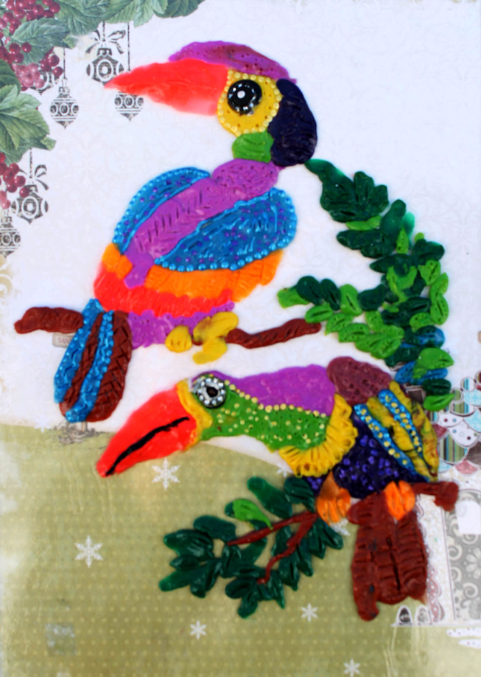 пластилином " Гамма" стали расрашивать туканов. По верху рельеф стеками придали. Далее акриловыми контурами расписали. Покрыли акриловым лаком поверху. Захотелось какого-то