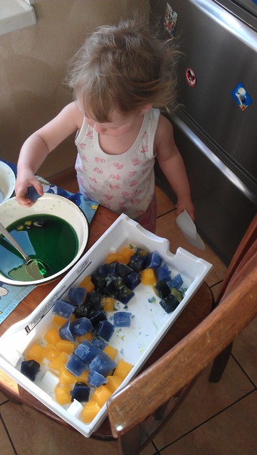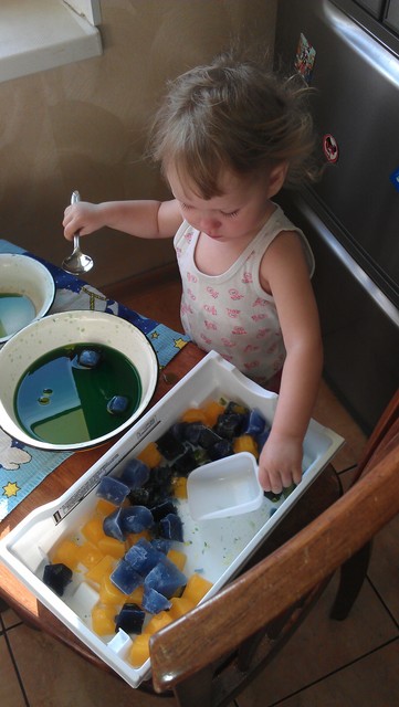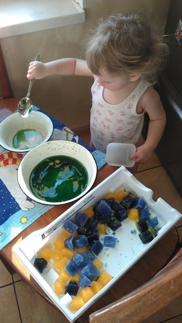Наморозила ей с вечера льдинок разноцветных, дала пару мисочек, совок, ложку и пошло-поехало...Ну чем не развитие?