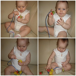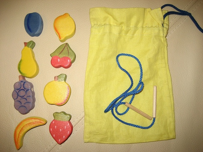 Ну, это наше самое любимое занятие. Фигурки достаточно крупные. Шнурочек хорошо прикреплен к двум деревянным иголкам. Маленьким пальчикам, конечно. удержать иголку сложно, но доченька очень старается. А когда получается нанизать фрукт, сразу начинает хлопать в ладоши: «Яночка-молодец!»