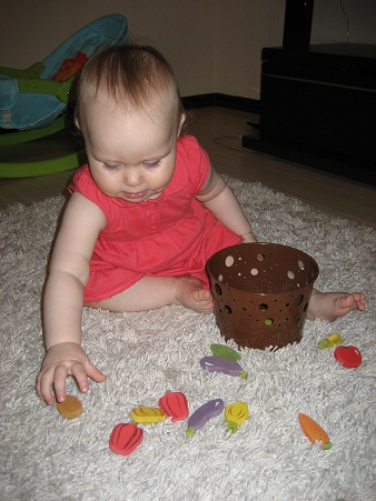 Но и тот и другой способ нам еще рано. Поэтому мы просто рассматриваем овощи, называем и складываем в мисочку. На зуб тоже попробовали. Краска не облезла. А вообще, с ними можно придумать целую массу игр.