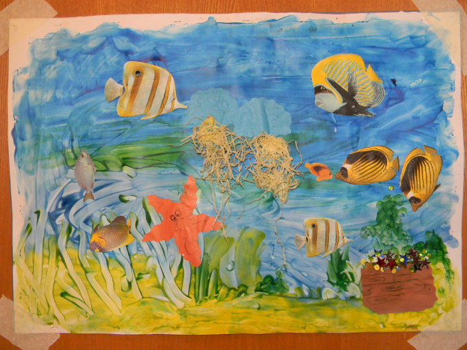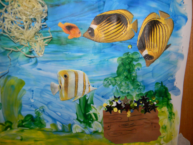 и в продолжение морской темы,сделали такое панно,фон-пальчиковыми красками размазюкали,рыбки-из остатков обоев,медузы и недовольная морская звезда из цв.бумаги и пиратский сундук сокровищ!