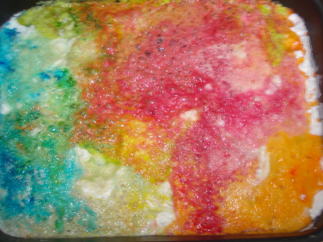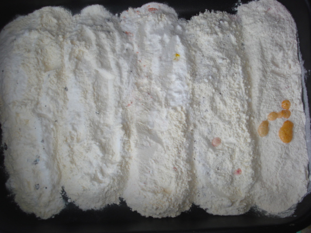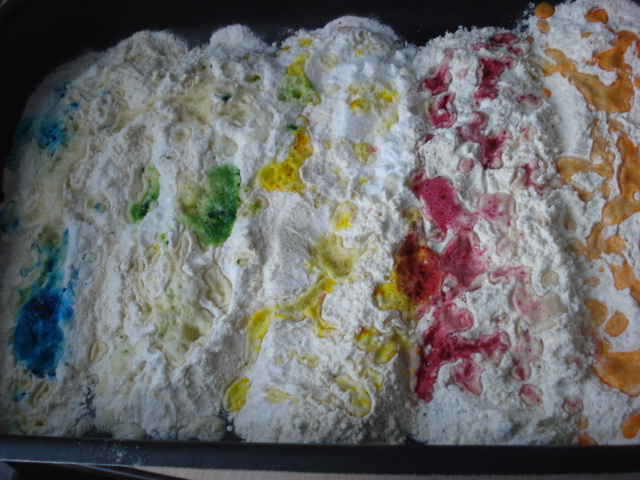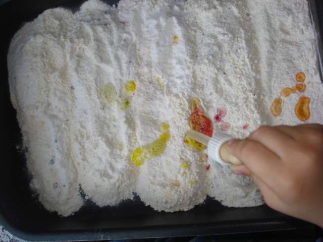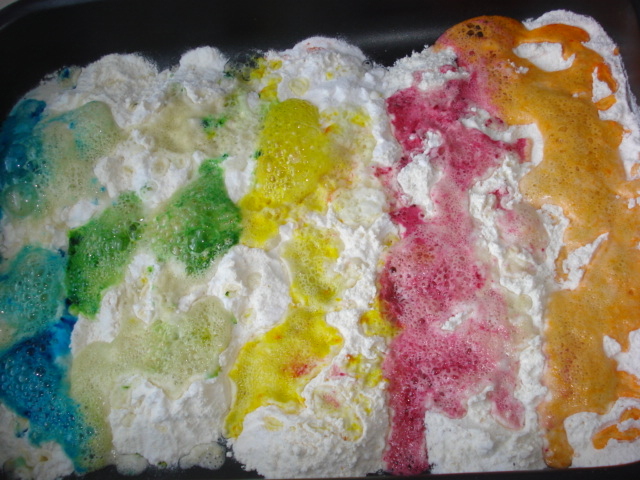 Смешала в равных частях муку и соду+краситель пасхальный (сухой порошок) отдельно яблочный уксус и столько же воды.