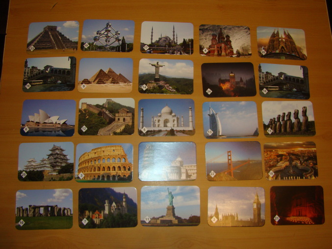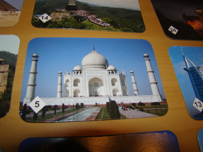 1.Делим карточки пополам (25 шт - в одну колоду, повторные карточки - во вторую колоду) Первую половину карточек раскладываем изображением вверх. Я показываю карточку из второй колоды (называя её) - дочка ищет такую же среди разложенных. Когда карточки будут изучены, можно не показывать карточку, а просто просить ребенка найти среди разложенных нужную карточку. Или называть страну, а ребенок будет находить карточку с имеющимися там достопримечательностями.