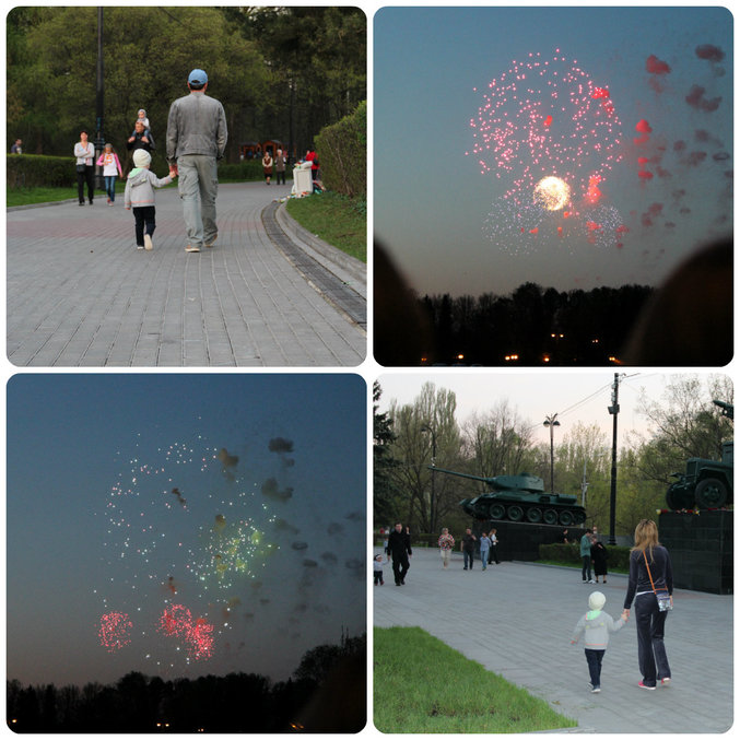 Приехали домой, поспали всем семейством (свет во всем районе был отключен пол дня) и выдвинулись на салют в Измайловский парк. Как положено сначала карусели, а потом уже все остальное))))