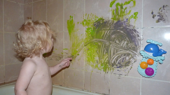 В добавок к пальчиковым краскам у нас еще есть штампики! ему интересно!!! куча игрушек и папа, поющий песни))))) но мы не купаемся в ванне каждый день, т.к.вода не очень хорошего качества и когда мы только переехали в этот город месяца 4 у него была аллергия! когда мы поняли, что на воду ограничили купание! если не боится душа, то почему бы просто не сполоснуться!