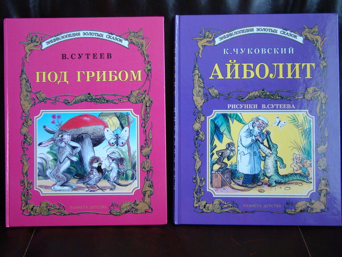У нас есть "Доктор Айболит" в сборнике Сутеева, но сборник очень тяжелый и сама дочка его не достает, поэтому заказала "Айболита" отдельной книжкой. ОЧЕНЬ-ОЧЕНЬ довольна! В книжечке " "Под грибом" четыре сказки; Под грибом, Цыпленок и утенок, Дядя Миша и Яблоко.