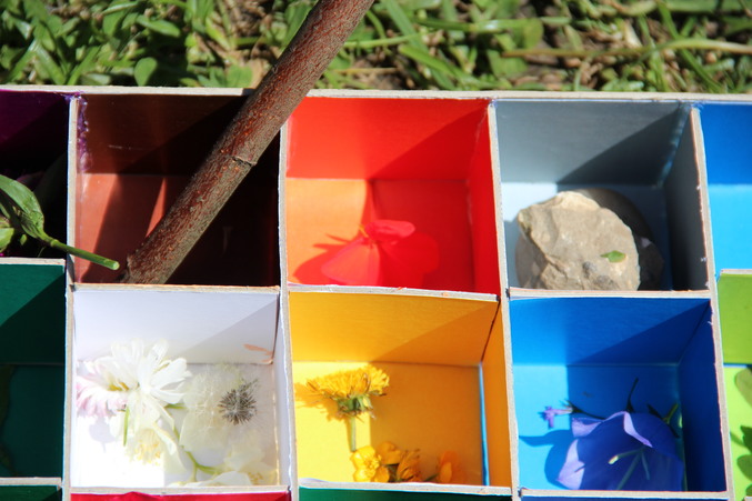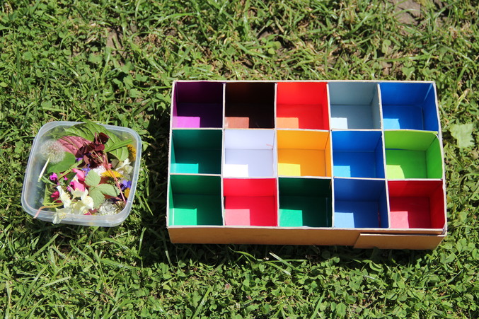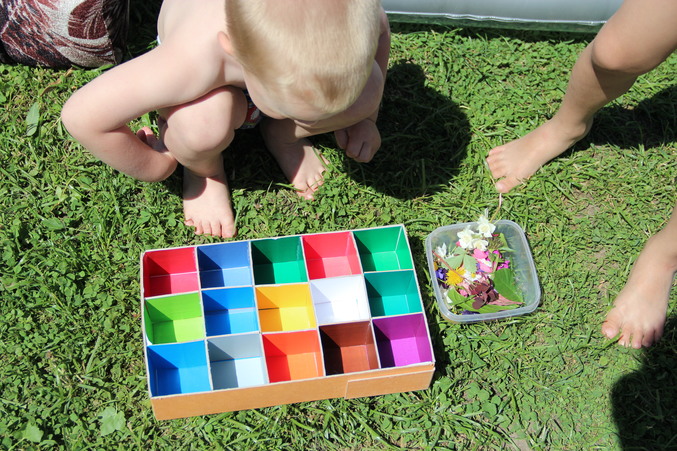 Насобирали с Алешкой и Лизой (младшая племяшка 4,5 г) разные цветочки, листочки. Задача детей отсортировать по цвету. Алешка достаточно быстро все сделал и было видно что ему это нравится))) Но закончив свое дело, пошел дальше собирать камни чтоб кидать в речку(((( Пока мы еще у мамы, предложу еще раз такое задание. Лиза все зеленые листочки запихала в один зеленый отсек и все))))