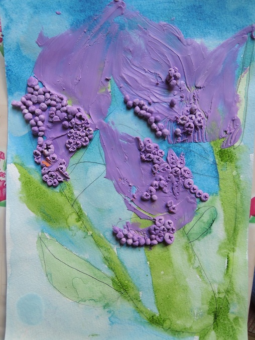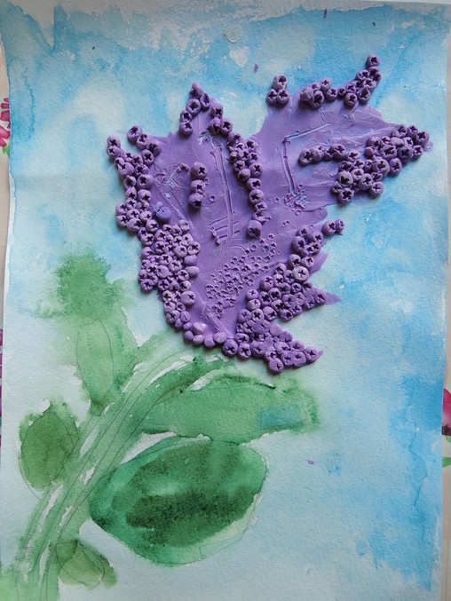 Сегодня делали сирень. Так прекрасно в этом году она цветет,что вдохновила меня своей красотой и ароматом. Вот что получилось у девочки 8 лет: