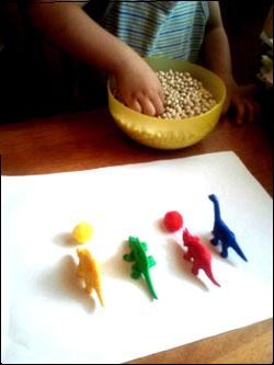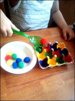 И сортировали их по цвету при помощи ложки,вылавливали из воды и раскладывали по тарелочкам,а так же искали их в крупе: