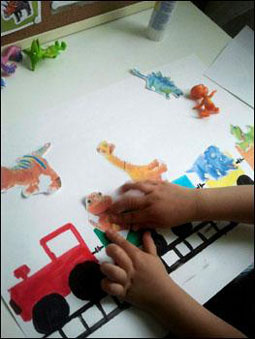 И я предложила проехаться героям на поезде.Для этого их нужно было намазать клеем и приклеить к вагончикам.