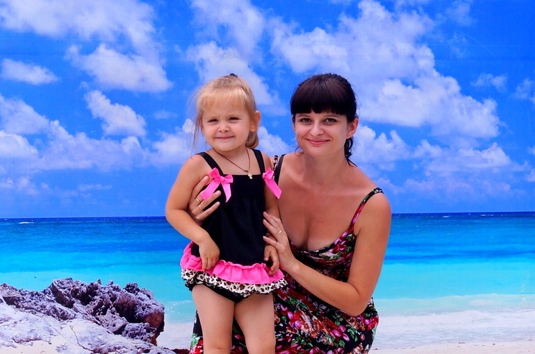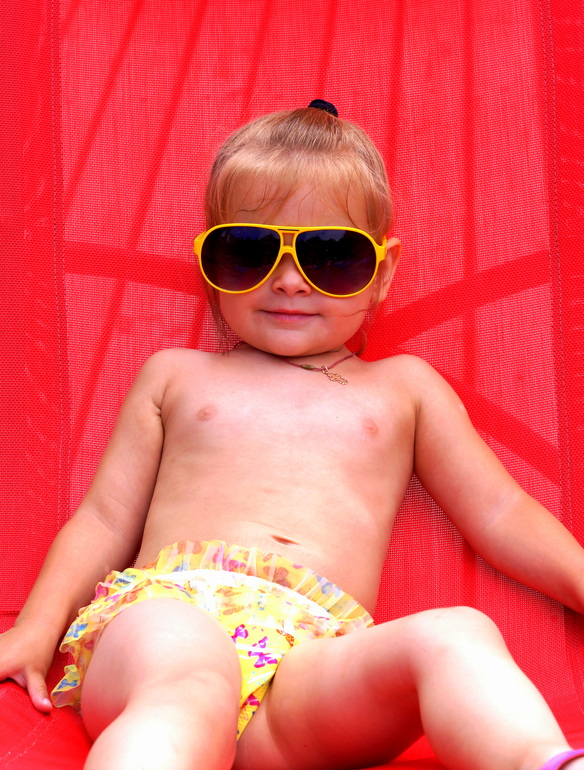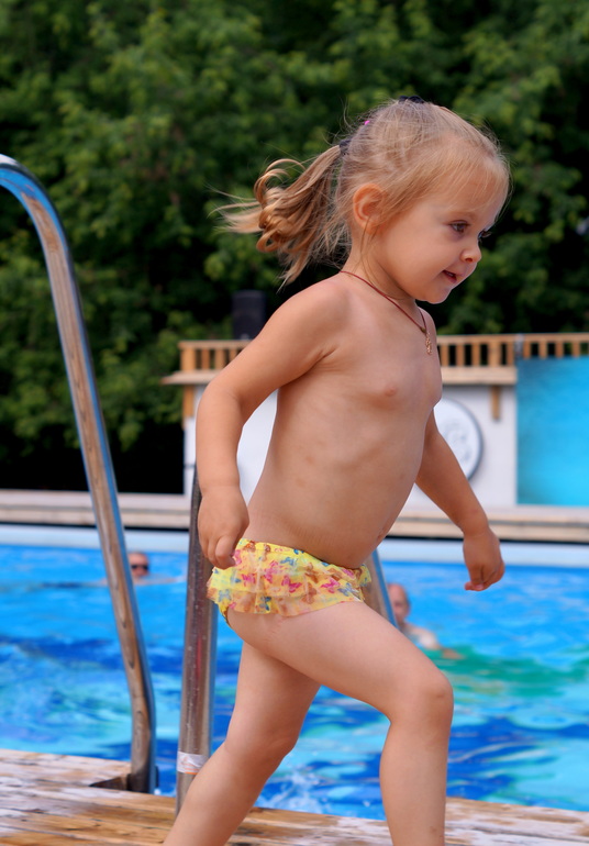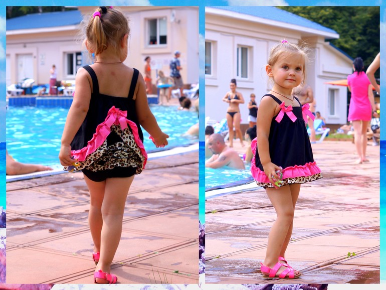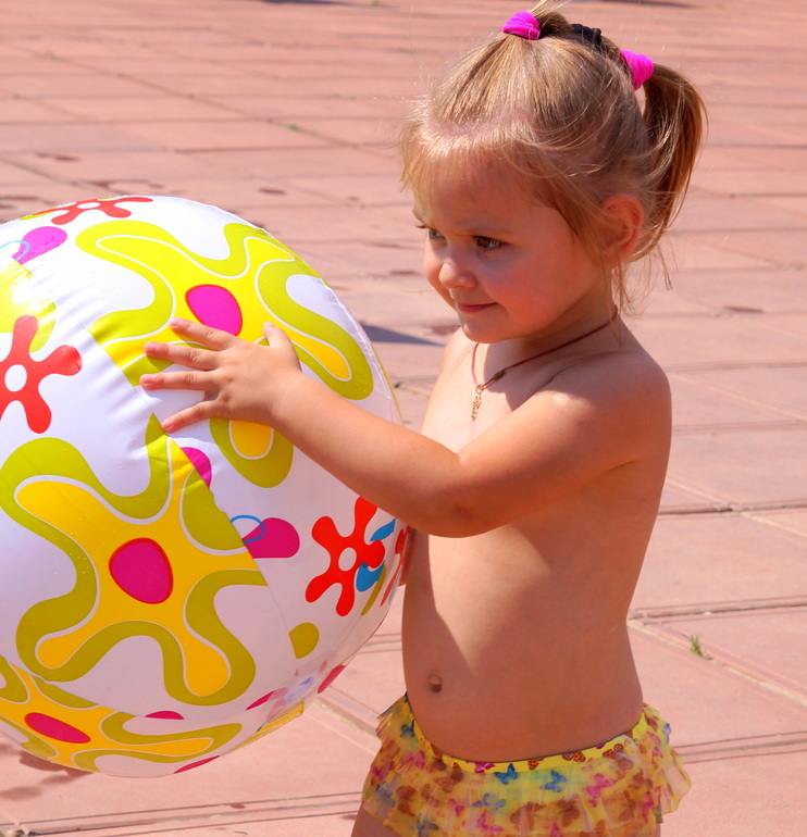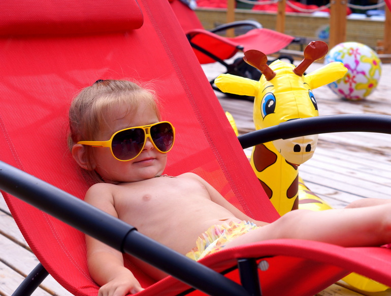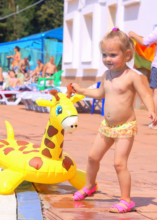 Домой мы вернулись загорелые и довольные, аки слоны! Дочка не купалась, но это ничуть ее не расстраивало да и нас тоже! Она бегала вокруг, плескалась, смеялась и бросала в бассейн все свои надувные игрушки)