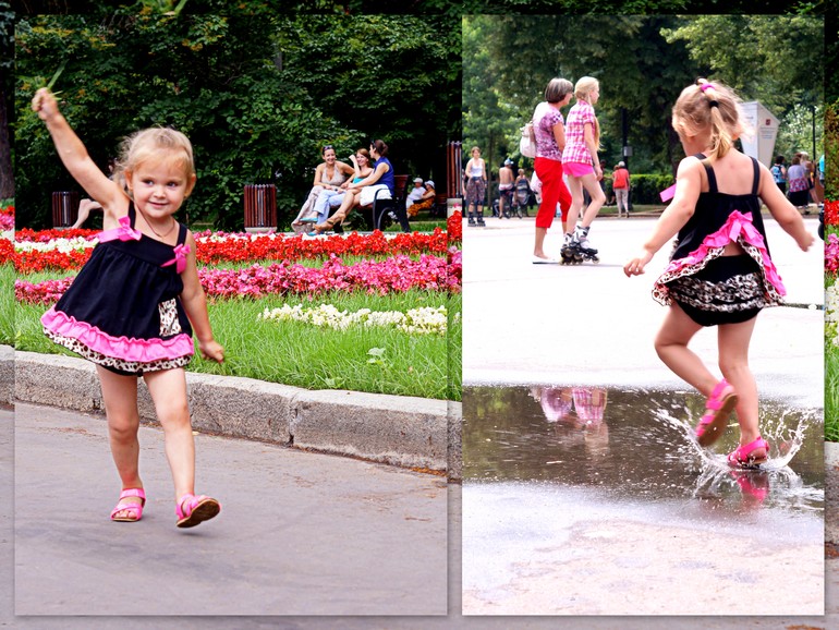 А главное, наш маленький трусишка- дочка, которая даже боится ножки в бассейне намочить, обскакалась по лужам! Она так радостно и задорно плескалась, что привлекала всеобщее внимание окружающих)