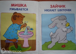 "Моя первая книжка" По этой книге начали заниматься после 10 месяцев.Крупные картинки,узнаваемы,никаких лишних деталей. Пособие предназначено для развитии речи и мышления ребенка. Стимулирует к подражательным действиям.Знакомит малыша с более сложными глаголами .На родительской страничке даны рекомендации по развитию речи ребенка первого года жизни и по месяцам расписаны темпы развития .Имеется картонная вкладка с маской медведя.