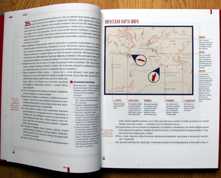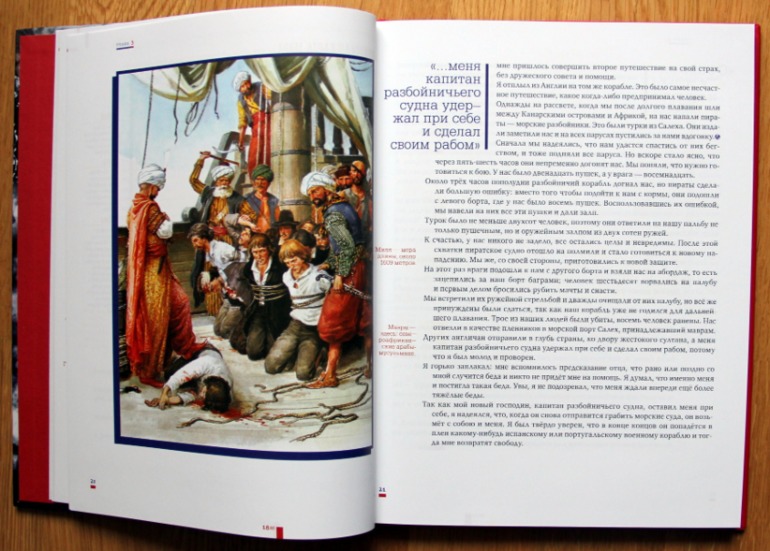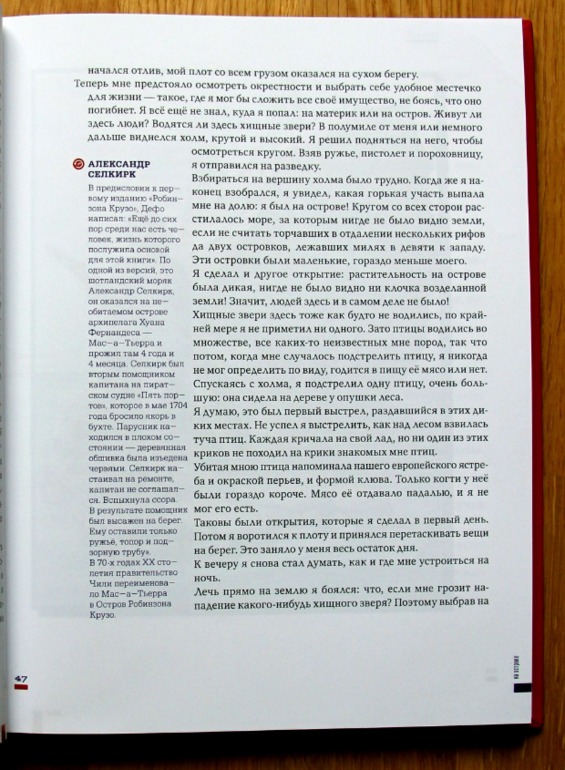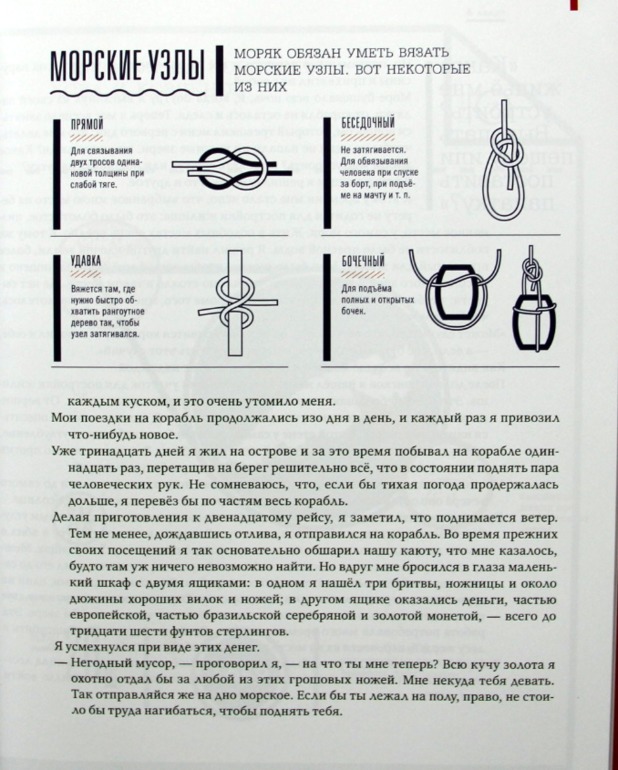 Книги (все о развивающих пособиях и книгах полезных для родителей)Хочу показать замечательное издание "Робинзона Крузо". В этой книге, помимо классического варианта текста в переводе Чуковского и замечательных иллюстраций, разработана целая система справочных комментариев. Здесь ребёнок найдёт множество полезнейшей (для него!!) информации, которая поможет лучше понять текст (там и нужные для понимания исторические сведения, и расписано, сколько лет Робинзону в разных эпизодах) и подробнее задуматься о многих аспектах жизни на необитаемом острове - про то, как вязать морские узлы, сделать стул из ничего, поздороваться на разных языках, что такое морская болезнь и как с ней справиться, про типы кораблей, их оснастку, пиратскую карту мира и разное другое, не менее важное... Я в детстве с такой книгой, натурально, спала бы в обнимку...