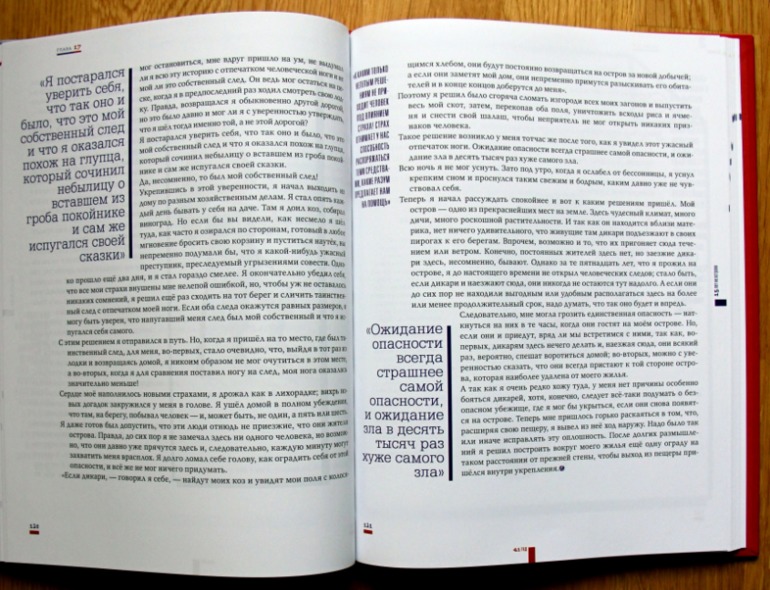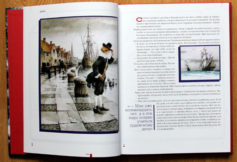 - внизу страницы - примерный возраст Робинзона (какая замечательная идея! я, кстати, в школе как-то раз задумалась о возрасте изучаемого персонажа - им в тот момент был Иван Грозный, и в лёгкую выучила все нужные даты, потому что разложила это на "а в 7 лет у него умер отец" и т.д., очень долго потом помнила, даже сейчас основную канву; и мне кажется, это хороший ход при чтении книжек - соображать, сколько кому из героев было лет и когда, собственно, всё это происходит),