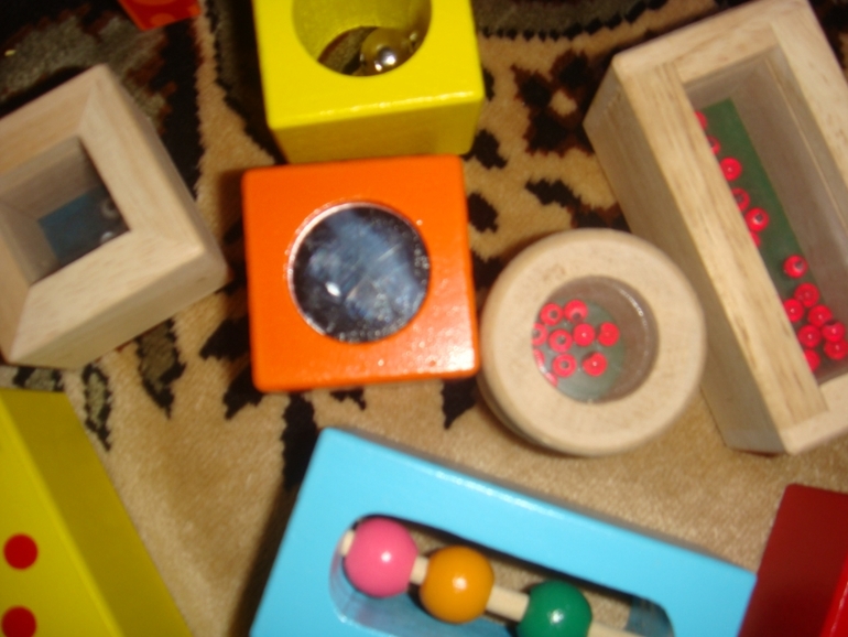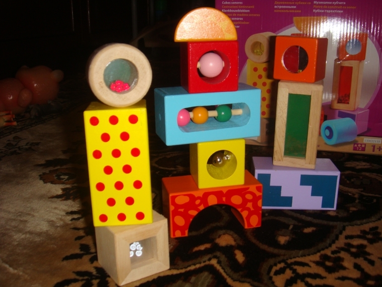 Сначала я немного разочаровалась. Мне показались они маленькими. НО Лиза оценила. Они ведь звучащие. В каждом кубике что-нибудь звенит. Лиза перебирала их ручками, трясла, строила башни и рушила с веселым звоном.