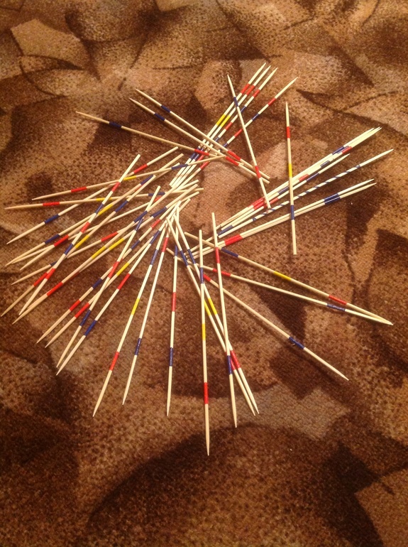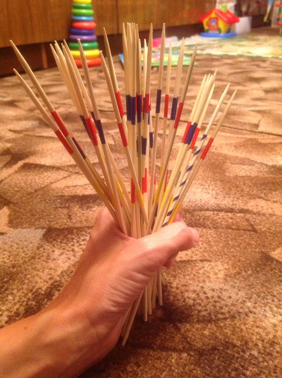 1. Собираем все палочки в кулак, ставим на ровную поверхность, разжимаем пальцы и палочки рассыпаются по поверхности.