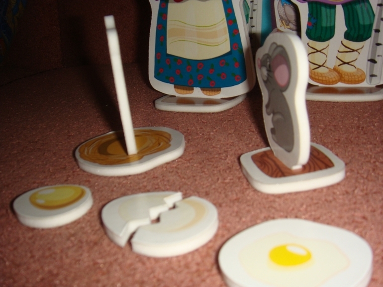 Конструктор деревянный и Лиза частенько любит его грызть. Но пока с ним все в порядке. Разыгрываем сказку. А потом Лиза просто играет с фигурками, селит их в домики из кубиков. А еще просто любит строить из персонажей башню. Вообщем не дорогая, полезная и интересная вещь. Рекомендую.