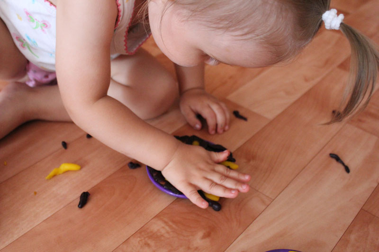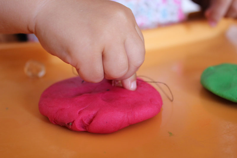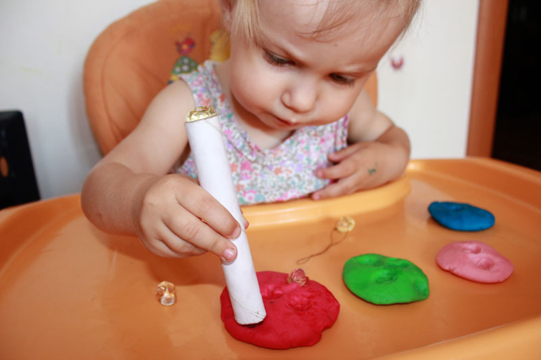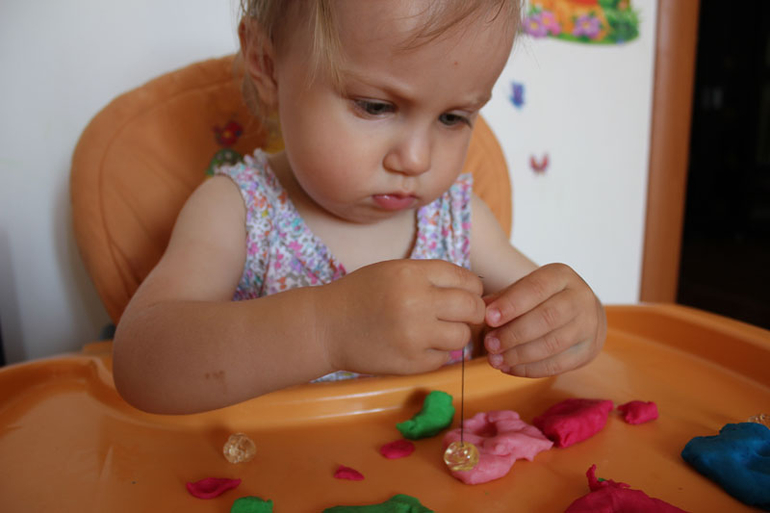В одну из бусин продела ниточку, получился "выдергивательный" штамп. Варе понравилось впечатывать бусинку в пластилин, ловить ниточку и дергать ее. Так выдергивает,что бусинка вылетает за пределы рабочего пространства.