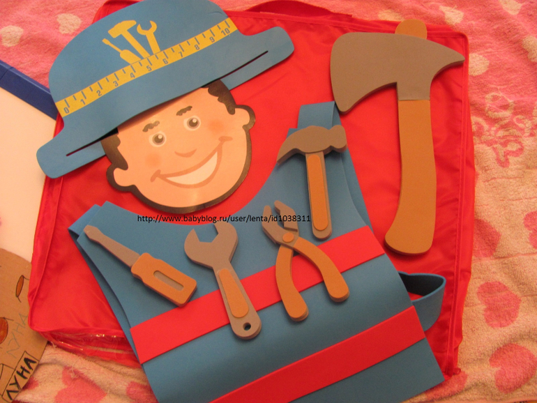 Подробно - строитель - 7 деталей - каска (у меня почему-то шапка строителя всегда ассоциировалась с желтым цветом), жилетка,инструменты.