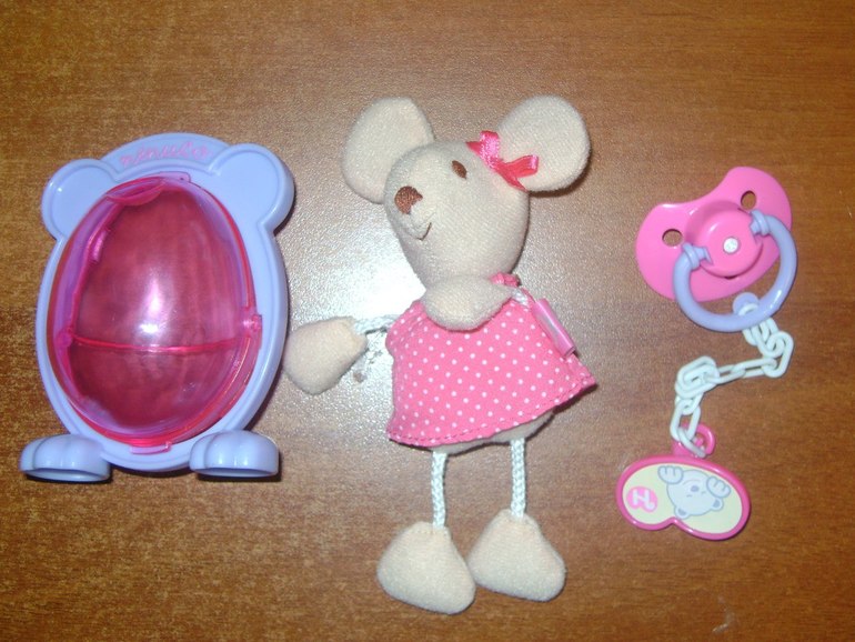 Внутри пупсик пластмассовый,в комплект с ним входит мягкая игрушка(мышка),пустышка и контейнер для хранения соски