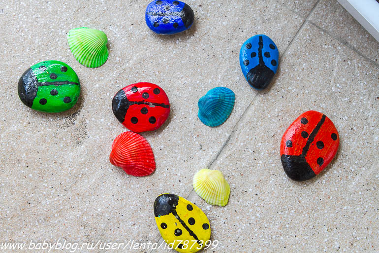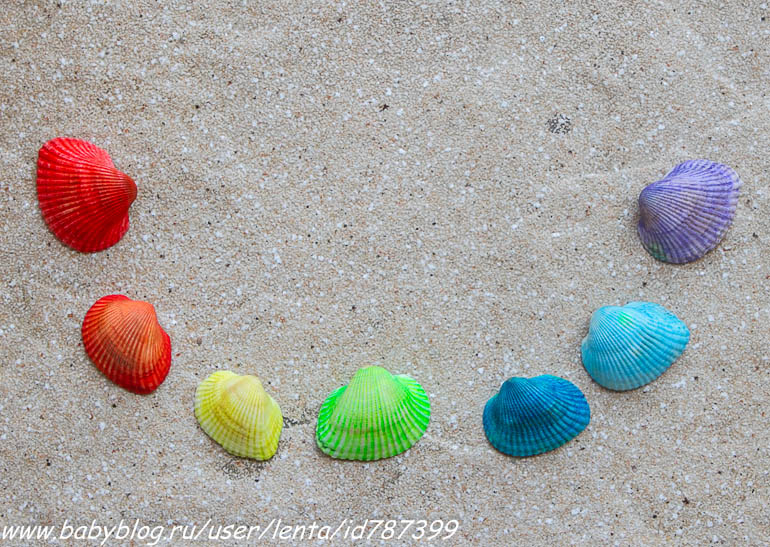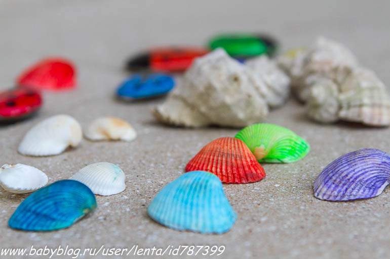 Увлекательная сортировка по цветам. Ракушки скафарки я тщательно отлавливала на пляже в течение пары недель, красить их - огромное удовольствие. Они и сами по себе, пожалуй, самые красивые в Черном море.