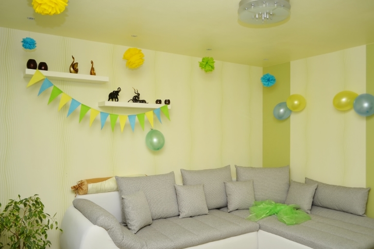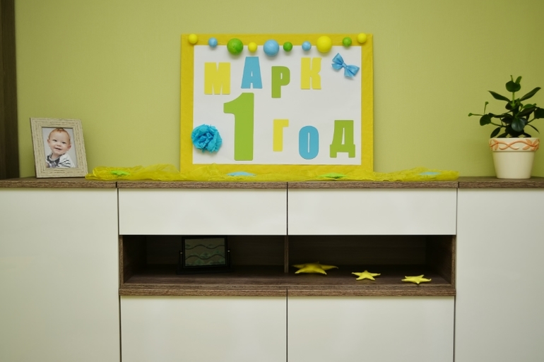 Украсили немного комнату, наделали цветочные шары, гирлянду из фетра, сшили звездочки, цифру, надули шары. Маркунька был под впечатлением))) Очень долго рассматривал комнату, затем играл с цифрой, шариками. Звездочки оставили для игр, высыпаем из корзинки и собираем снова.