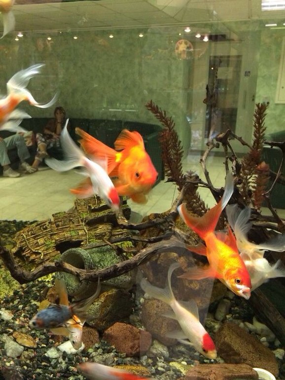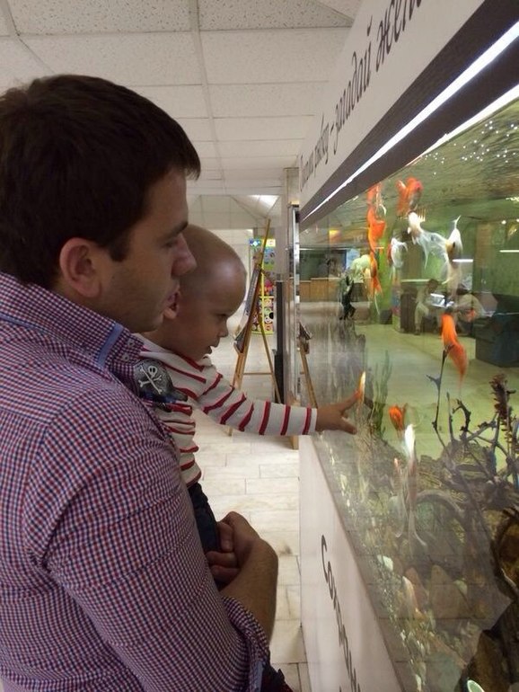 А пока мы собирались выходить Артемий наш застрял около большого аквариума с золотыми рыбками... Пора бы нам посетить океонариум...