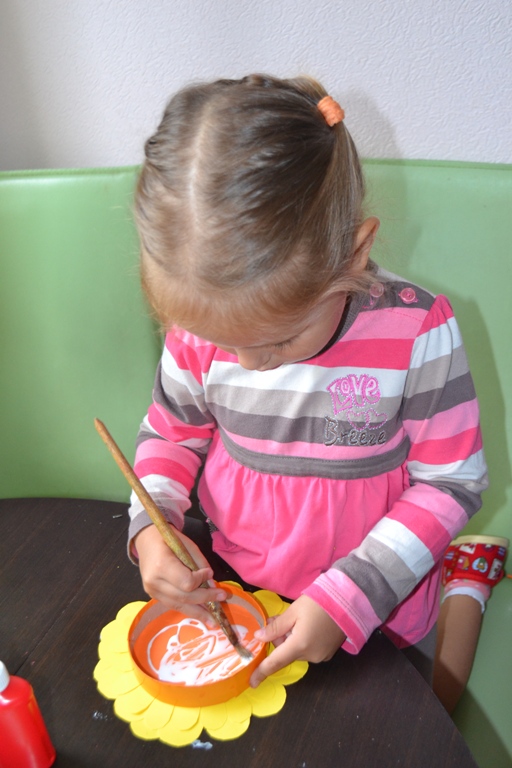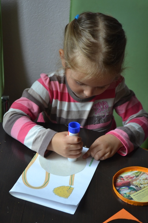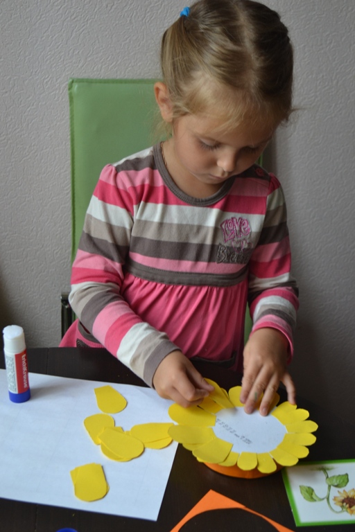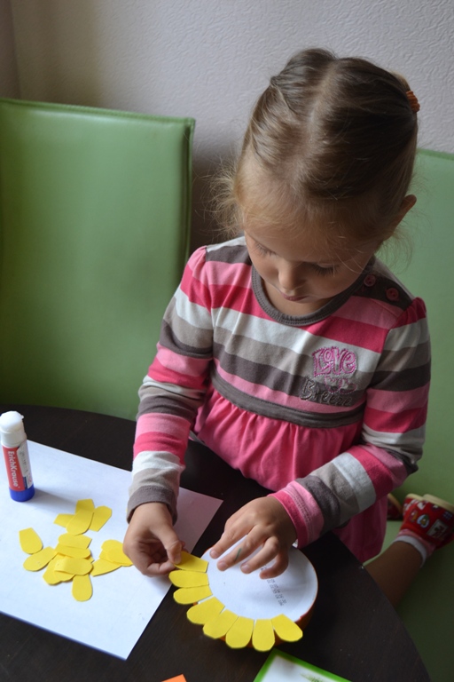 Заранее я вырезала много желтых лепестков. Сначала приклеиваем маленькие лепестки по кругу