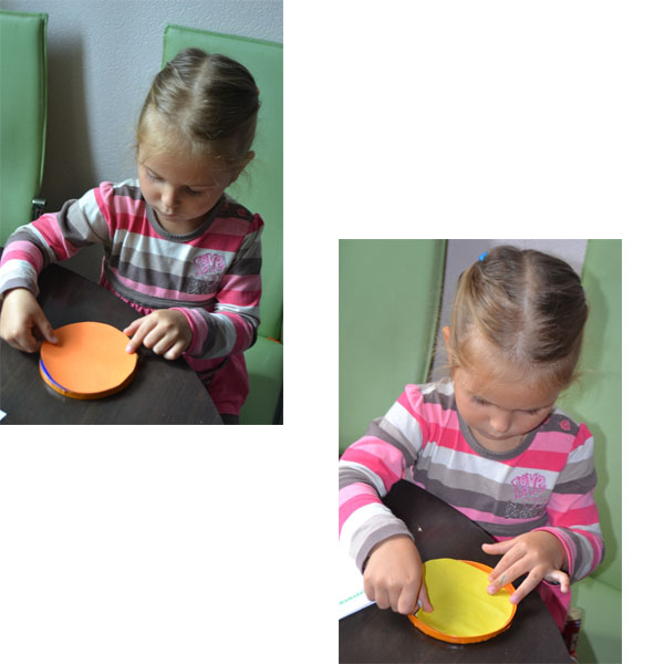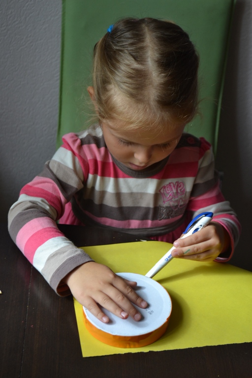 И приступили к процессу. Положили коробочку от сыра на лист бумаги и обвели. У нас получилось три круга: 2 оранжевых и 1 желтый