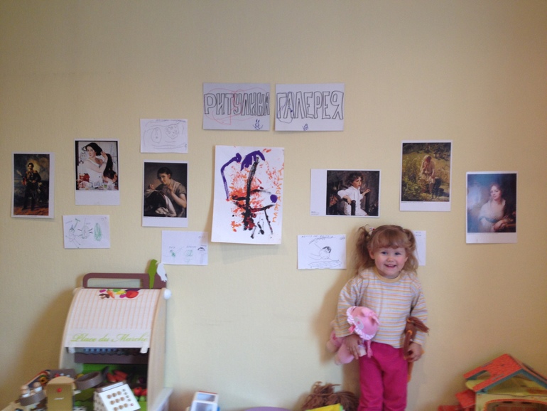 3. Как устроить выставку ритулиных рисунков и тем самым поддержать её пробудившийся интерес к рисованию. (Буквально с месяц назад мы перешли от каляк-маляк к "серьезным" рисункам (если человечки с ручками-ножками-глазиками и т.д.)