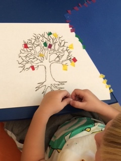 Цветную изолету нарезаем на кусочки не правильной формы или правильной, кому как нравится, и по одной даем ребенку - пусть приклетвает листья на дерево, под дерево .. Детишки постарше могут сами разрезать изоленту, проявив свои навыки и фантазию..