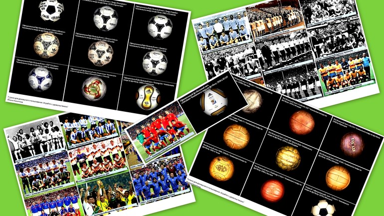 А что же это... Я нашла очень интересную статью об эволюции футбольного мяча и решила сделать лото с этими мячами и командами - победителями! Получилось всего 4 "с половиной" листа А4)