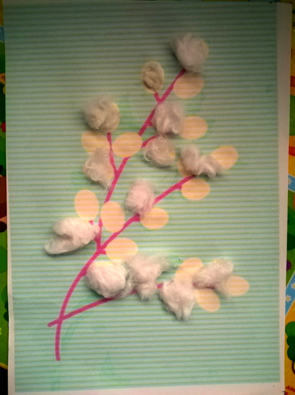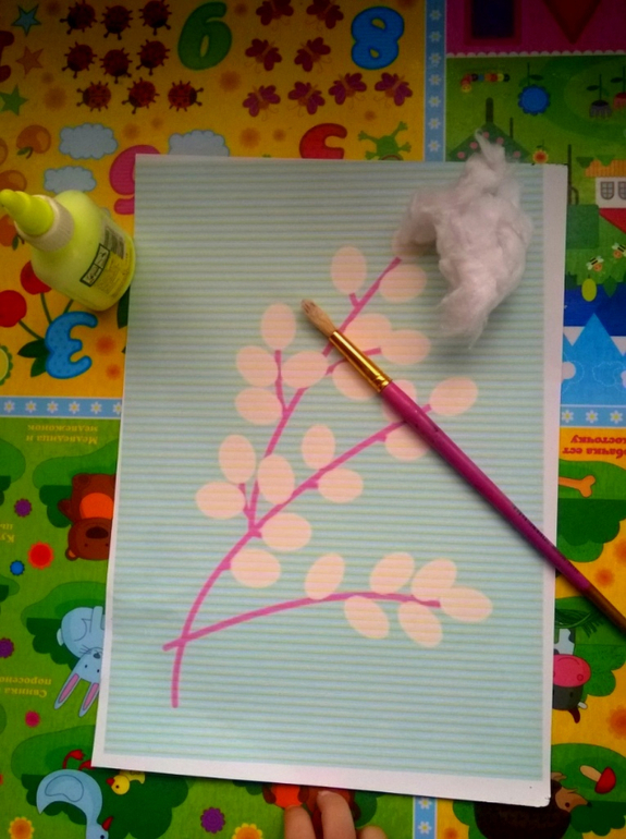 Мистер Умелец или Очумелые ручки (поделки, аппликации, интересные находки, идеи и задумки)Думаю многие занимались с детьми чем-то подобным вот и мы добрались до ваты.Украшали веточку так думаю вербы - ватой.Сыну по моему больше понравилось мазать клеем чем вату прикреплять потом. В начале все было с энтузиазмом, но на пол дороги все бросил и побежал кататься на беговеле. Как-то так.)) Задание я брала из пособия . Само пособие мне понравилось задания необычные, будем еще по ним заниматься.