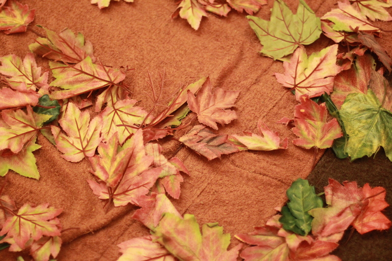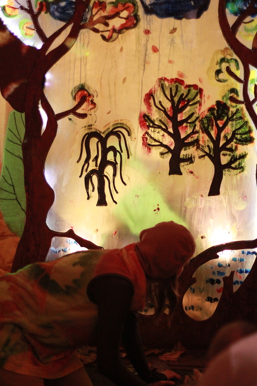 затем пригласили в маленькое помещенице, где собственно и происходил спектакль. Все в желто-красных тонах, на полу листочки. Красиво. Детей пригласили сесть полукругом и на витрине-стенде-витраже (не знаю как назвать) показали, как зеленые деревья становяться желтыми, оранжевыми.