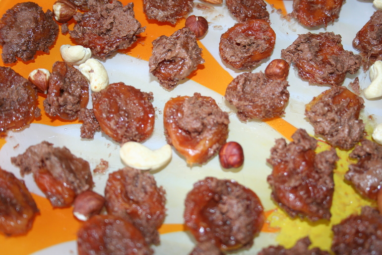 В рецепте было сказано, что нужно вилкой накалывать курагу, обмакивать в шоколад и выкладывать на тарелку для высыхания, но у нас это никак не выходило, поэтому мы просто забрасывали сушеные абрикосы в шоколад, мусолили их как следует, а затем я их уже вытаскивала на блюдо.