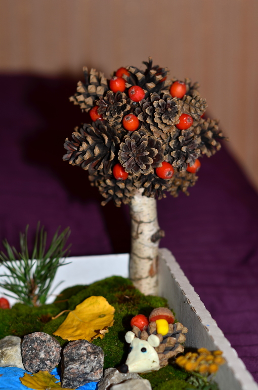 Я бы не отдавала в сад. Не вижу никакого практического смысла для ребенка в том, чтобы эта поделка стояла там на выставке. Даже если она выиграет какую-то там похвалу, то ничего, кроме тщеславия, это ребенку не принесет. А вот если она будет стоять у вас дома и дочка будет с ней играть, то пользы будет масса: тут и мелкая моторика, и познавание природы и творчество! А главное, ребенок запомнит, что можно из даров природы и подручных материалов сделать целый мир и классно с ним играть. И своим детям будет такие делать! А в саду достаточно показать! И хватит с них, имхо.