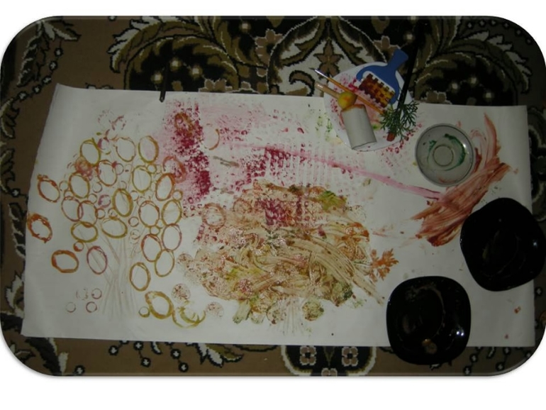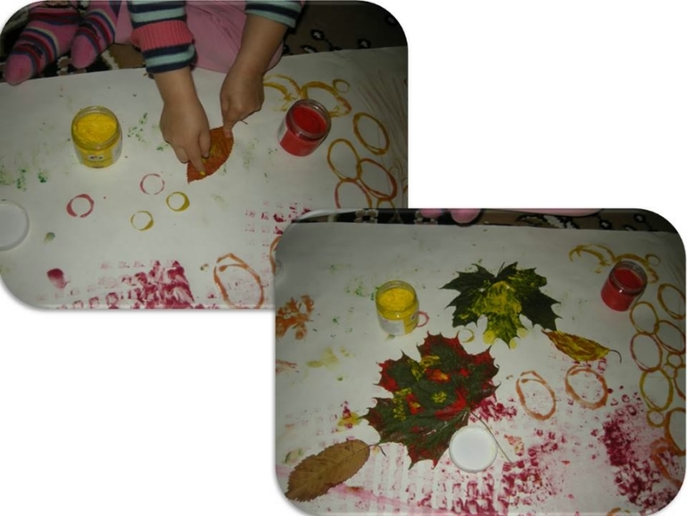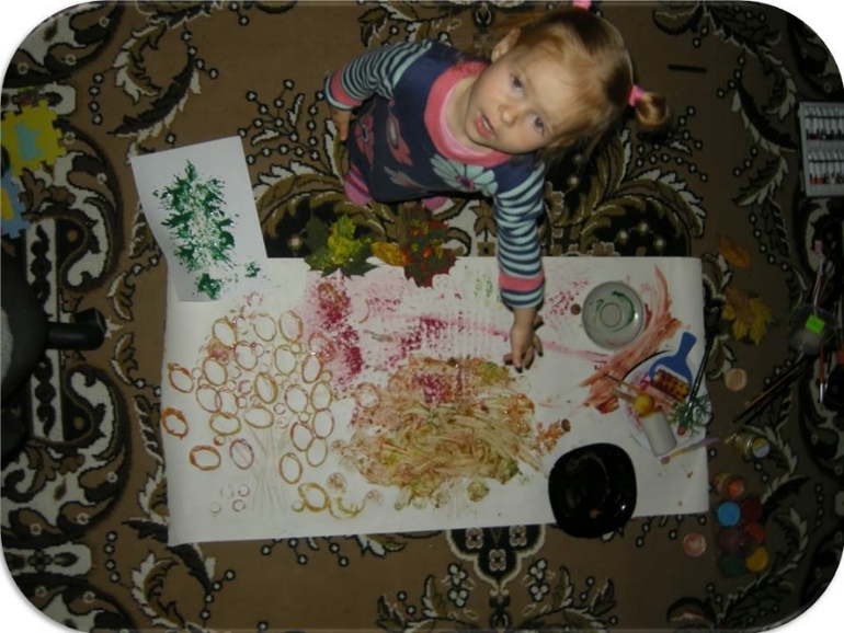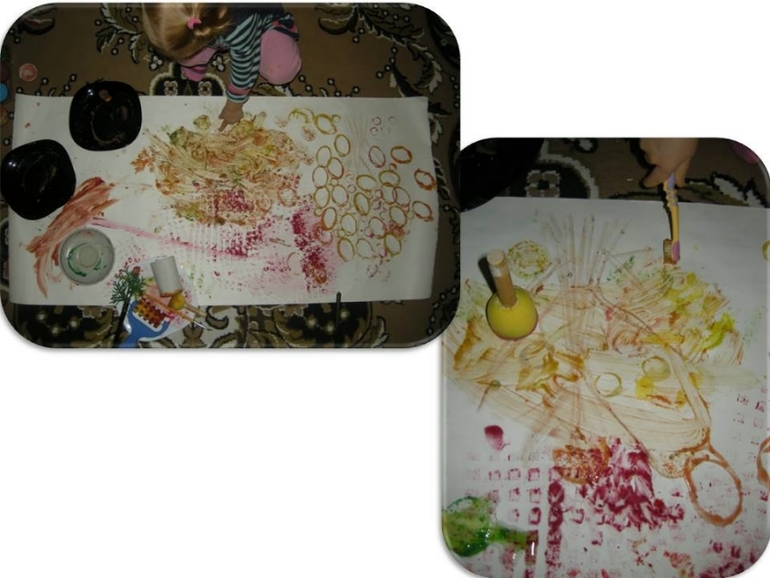 А тут началось настоящее веселье, я предложила проштамповать поролоном листики, Вике ранее нравилось, а тут наотрез отказалась, но я захотела сама попробовать, Вика взяла щетку и давай растирать мой отпечаток, все превратилось в смех и веселую игру, я все больше штамповала, а Вика все больше размазала, получилось у нас осенний ураган, вблизи не фотографировала, так как смешанные краски оказалось совсем не оранжевые, а достаточно не понятной расцветки))