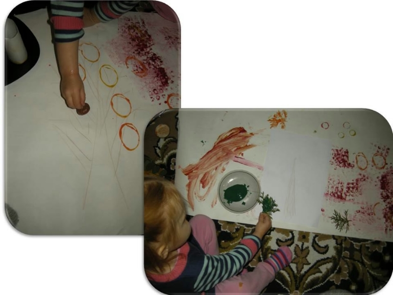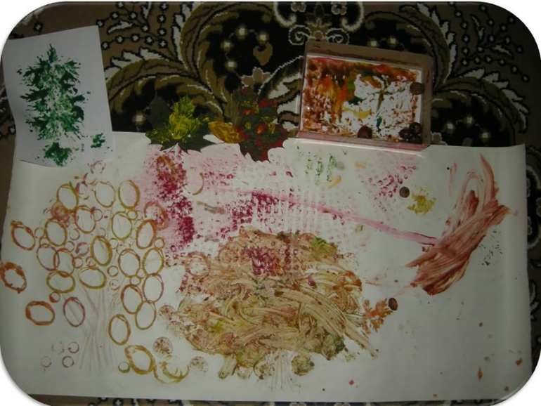 Еще рисовали крышечками с каштанов и веточкой туи (но туей рисовали на отдельном листе, так как для этого рисунка на отведенном листе места уже не нашлось))