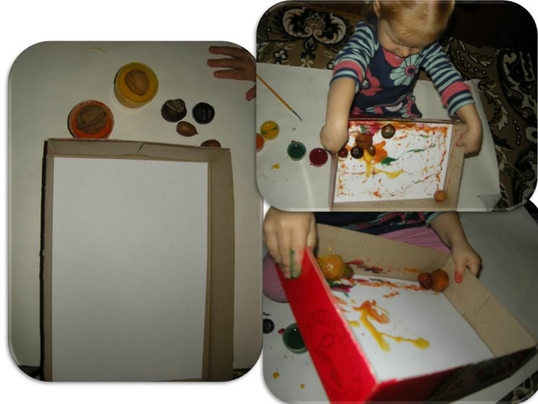 Так как все материалы с улицы были выложены перед Викой в коробке, она сама выбирала, чем хочет рисовать, далее было рисование каштанами, желудями и орехами.