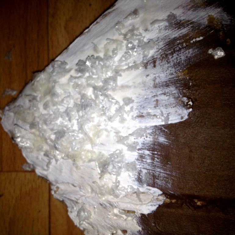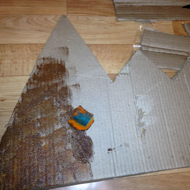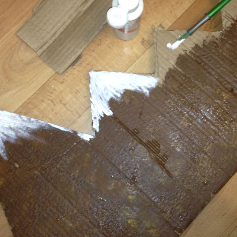 Горы по быстрому вырезала из гофрокартона, раскрасила акриловой краской и на клей ПВА насыпала вот такие хлопья, для имитации снега. На всё ушло максимум 20 минут, краска сохнет очень быстро.