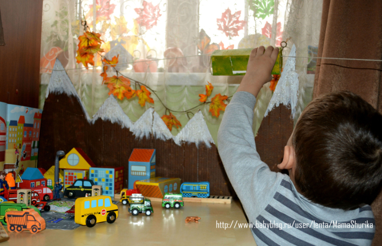 Горы кстати появились после поездки в Кисловодск. Шурик в начале самостоятельно сделал фуникулёр из верёвки и коробочки от машинки, потом попросил меня сделать горы и новый фуникулёр с "дверью" что бы можно было катать человечков.