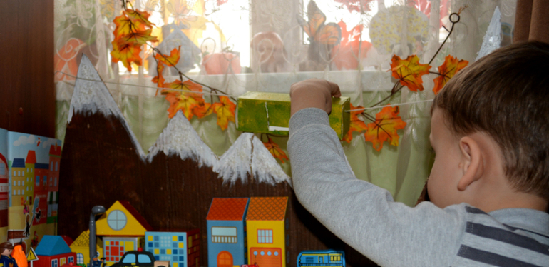 а вечером, перед сном, Шурик сам убирает все "миры" в коробки, кроме того что на столе.