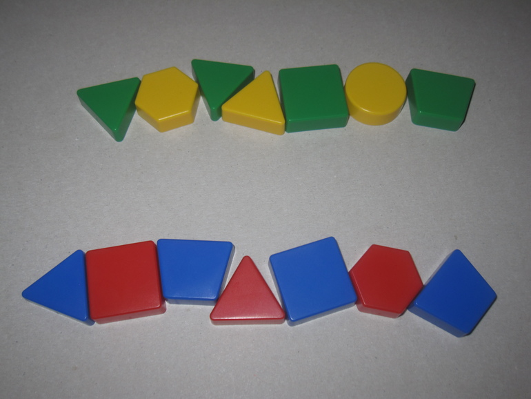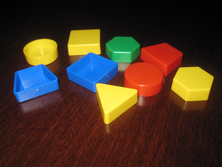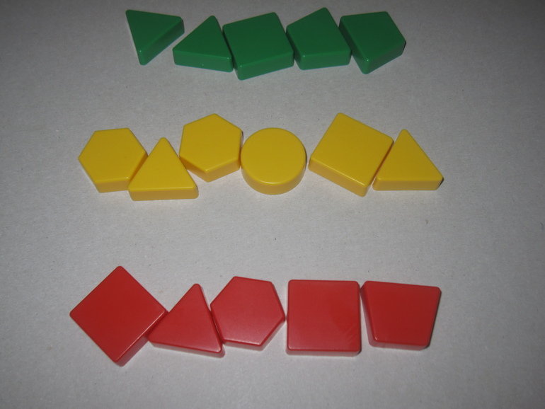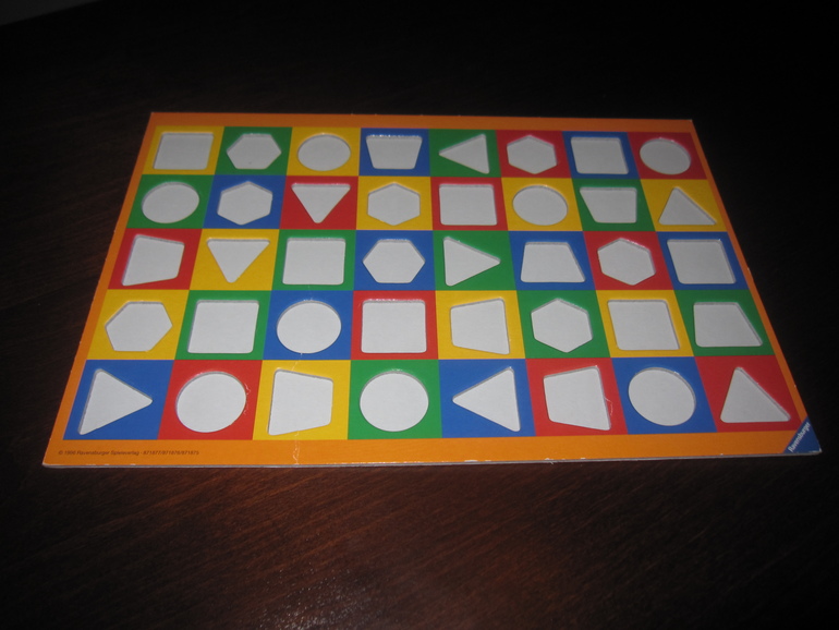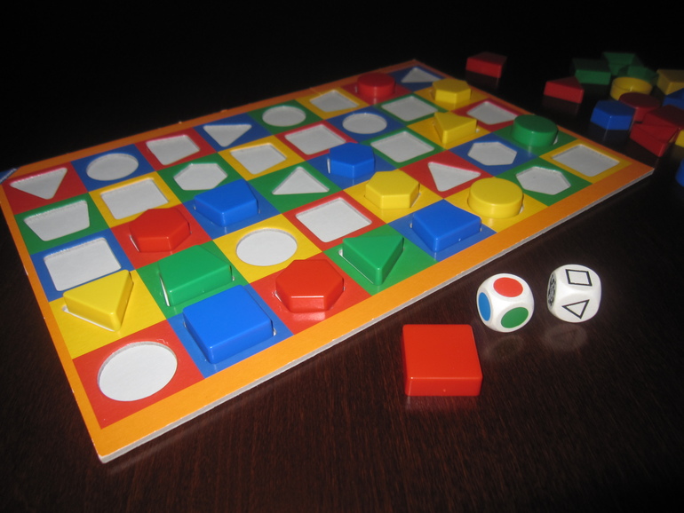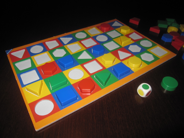 - 40 фишек для игры 4 цветов (красный, синий,зеленый, желтый) и 5 форм (круг, квадрат, треугольник, шестиугольник, трапеция)