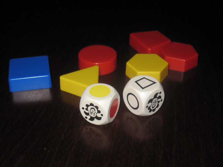 Уже в 3 года (а не 5 как в правилах) ребенок может освоить игру с двумя кубиками. Принцип игры тот же что и в предыдущем варианте - расставляете фишки на поле, кидаете 2 кубика, смотрите какой цвет и форма выпали, ищите на поле фишку такого цвета и формы (например, красный квадрат, зеленая трапеция) и забираете ее себе. Вместо формы выпал джокер - берете фишку выпавшего цвета любой формы. Например, выпал зеленый и джокер - берете любую фигуру зеленого цвета. Аналогично, если вместо цвета выпал джокер - берете нужную фигуру любого цвета. Например, на кубиках джокер и квадрат - берете квадрат любого цвета.