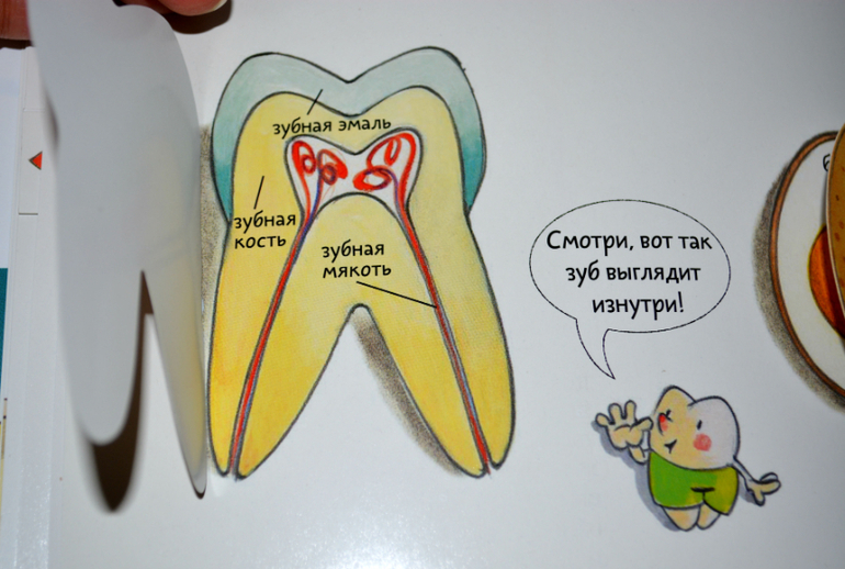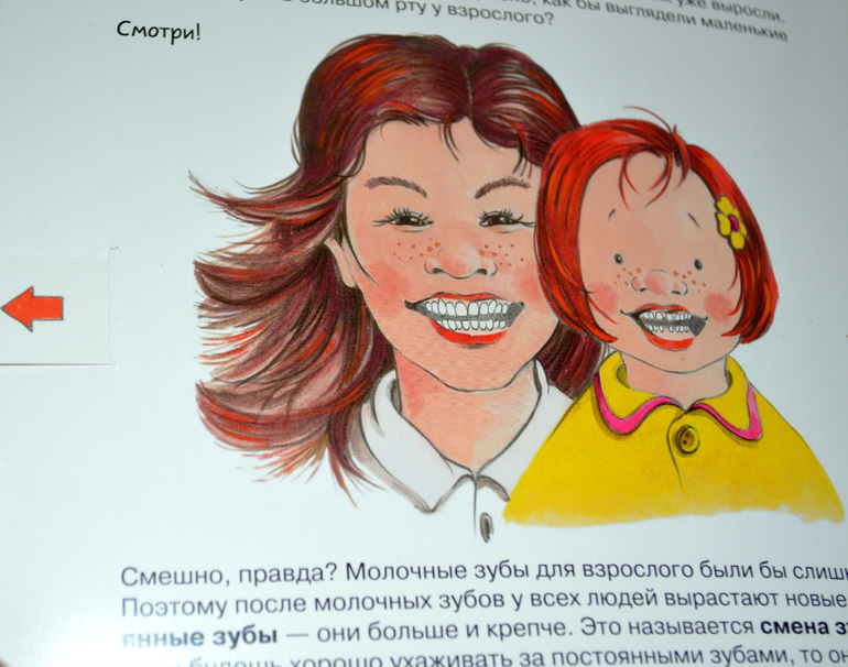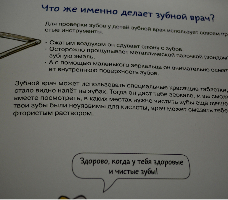 Теперь про текст, текст в книге отличный, рассказывается о том, что такое молочные зубки и как они появляются. Как устроен зуб и как ухаживать за зубами, кто такой стоматолог и многое другое. Текст очень простой, рассчитан на дошкольника, ещё мне понравилось, что идёт прямое обращение к ребёнку, с вопросами, как бы вовлекая ребёнка в интересную и беседу - игру...