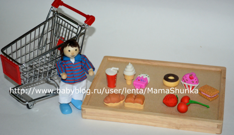 Тележка вот такая а продукты, да ластики Ластики "Фрукты" и ластики "Набор десертов
