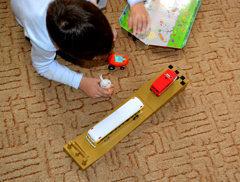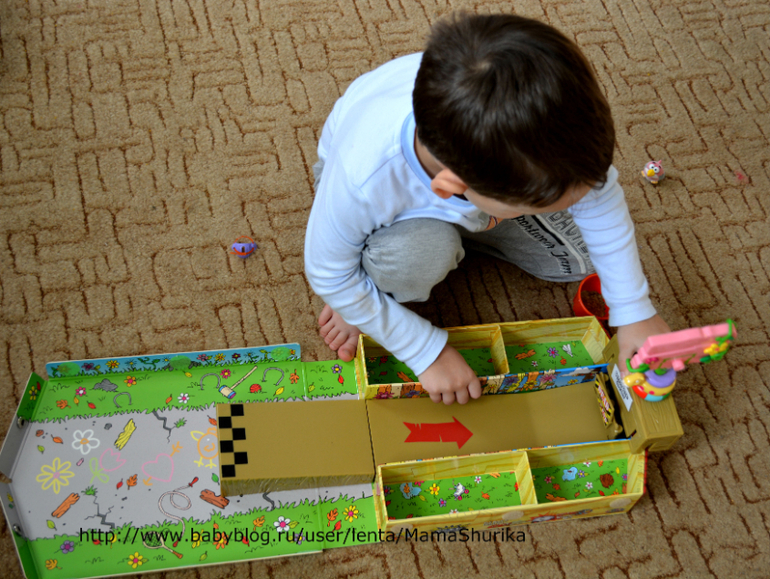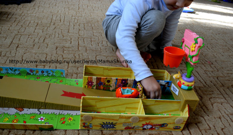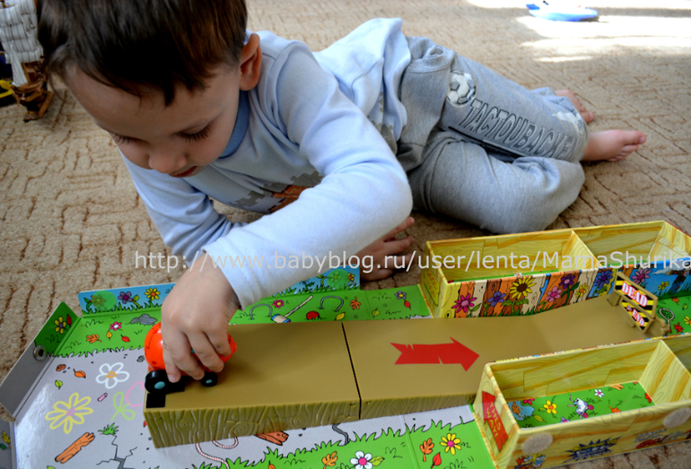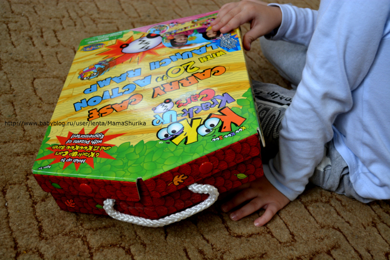 Шурику набор понравился, а ещё его удобно брать с собой, он складывается и закрывается очень быстро. Можно сложить туда мелкие игрушки и сипользовать как домик или сложить мелкие машинки и использовать как трек.