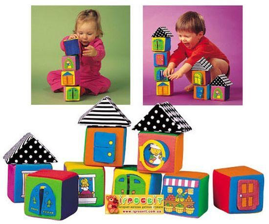 Кубики мягкие. У них прекрасные черно-белые крыши, которые можно положить в кроватку на уровне глаз ребенка как только он начнет фокусировать взгляд