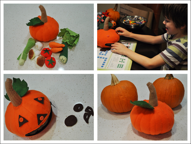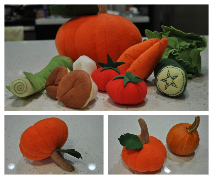 Вот сели мы, вынули все овощи из корзинки, назвали их по-английски, сложили в корзинку обратно... И как-то нам этих овощей стало мало. Или просто у мамы руки зачесались?.. Так или иначе, полезла я в Интернет за выкройками других овощей. И сшила перво-наперво тыкву. Бооольшую, ведь тыква должна быть больше всех остальных овощей, правда?..